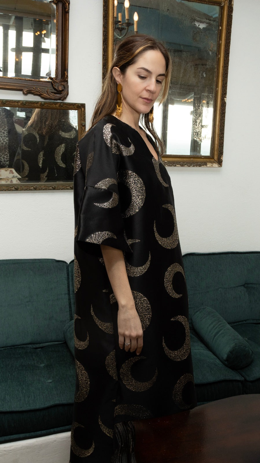 Brocard Abaya is a one-size elegant piece designed with a refined brocard finish, available in Moon Black, Gold, Writing Gold, and Writing Black.