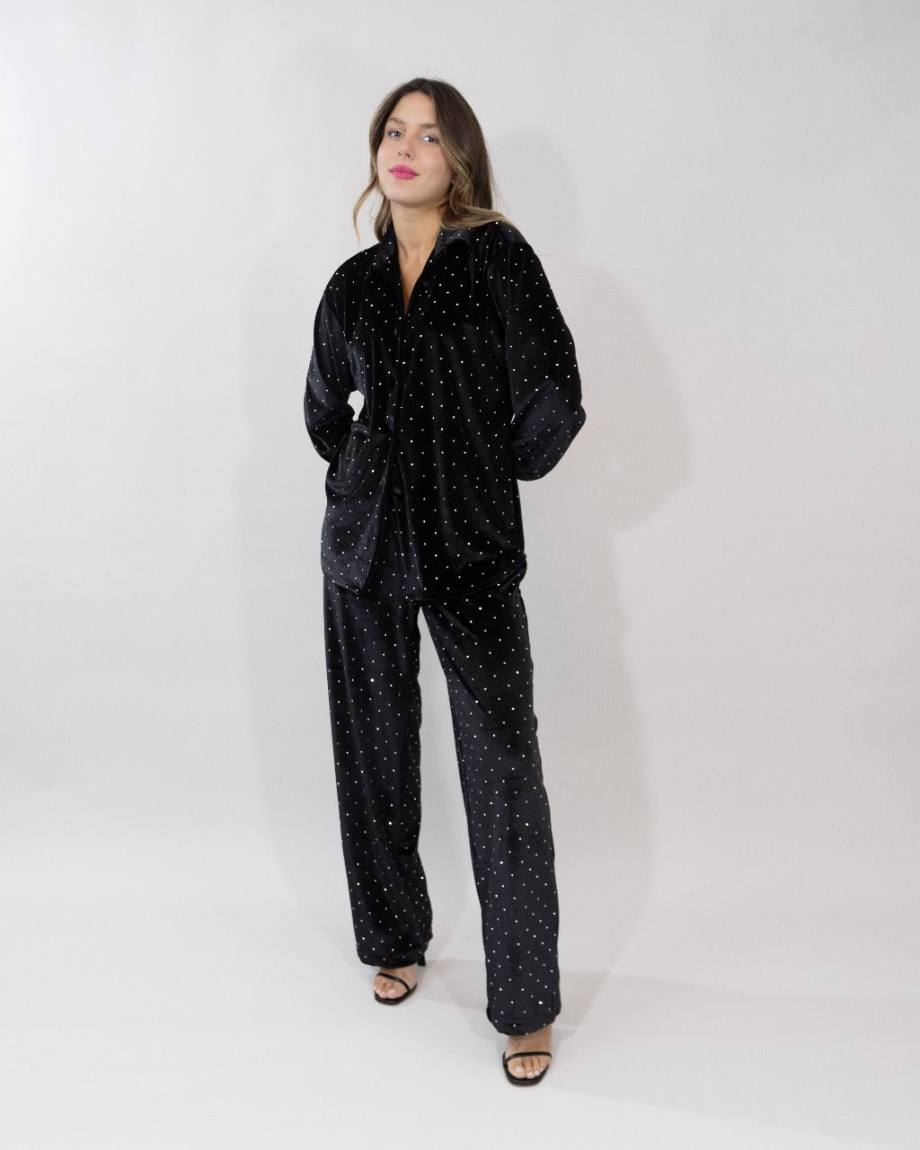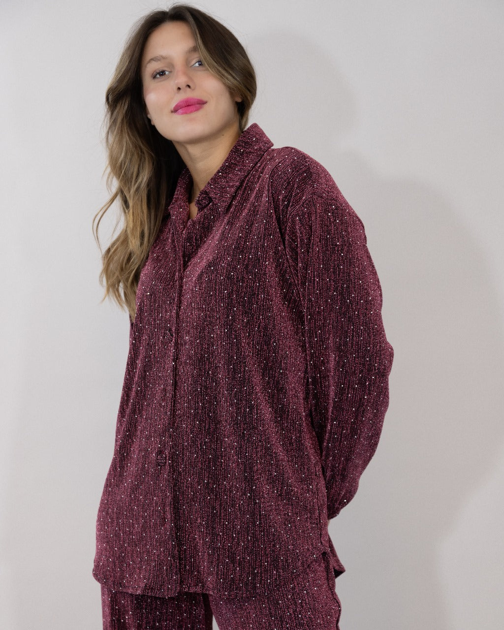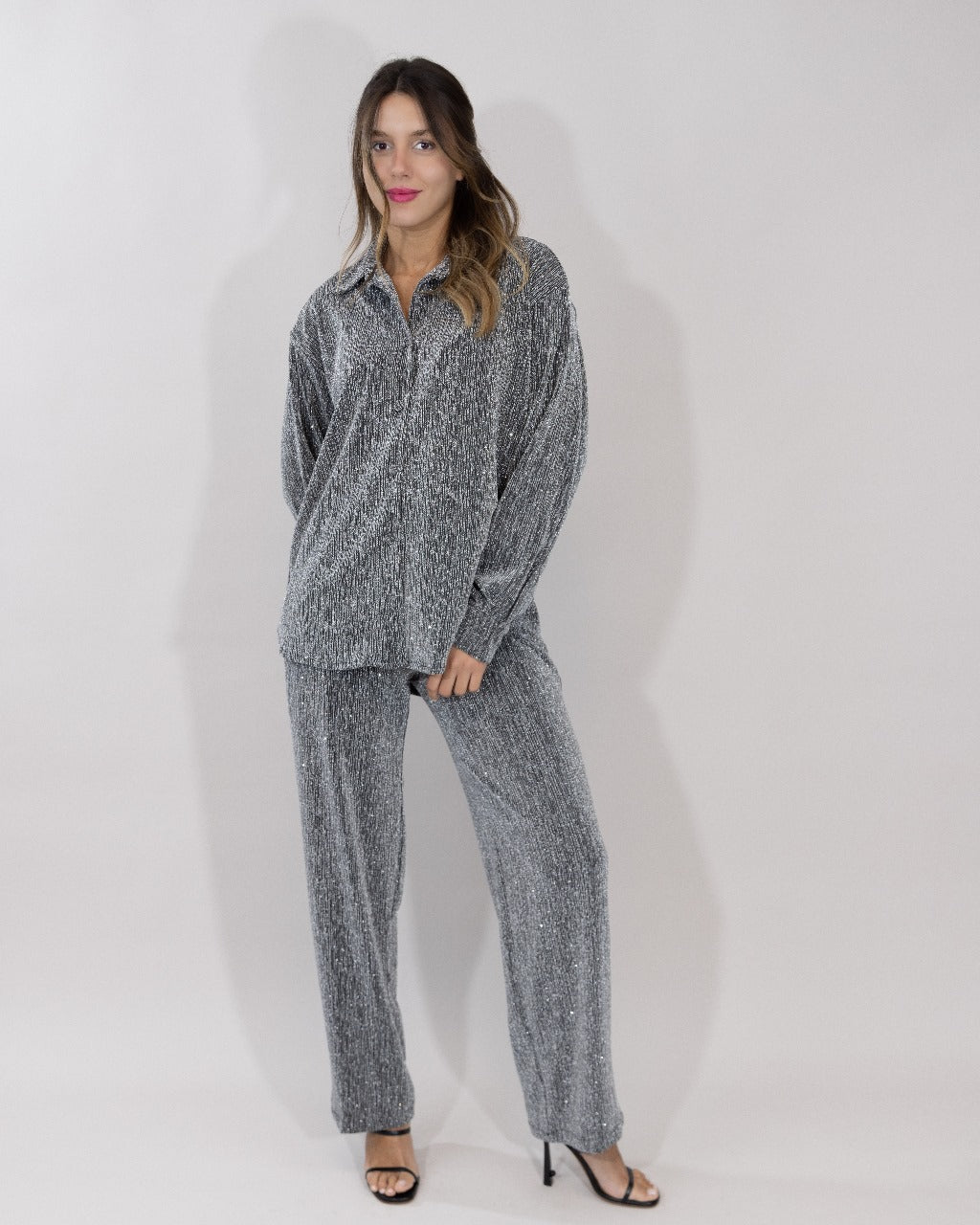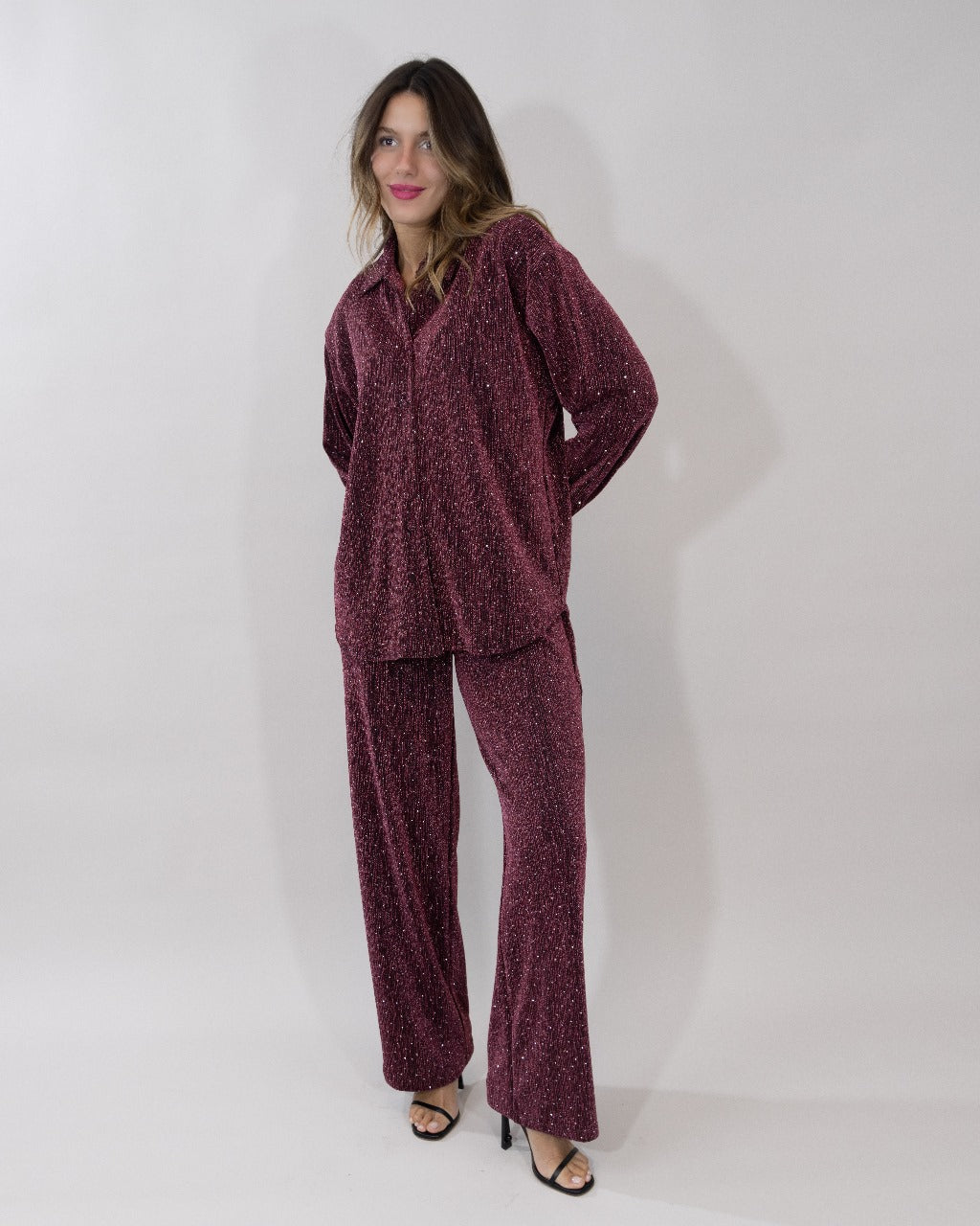 A chic stitched chemise and pant set designed for everyday elegance. Available in Black, Brown, Silver and Burgundy.