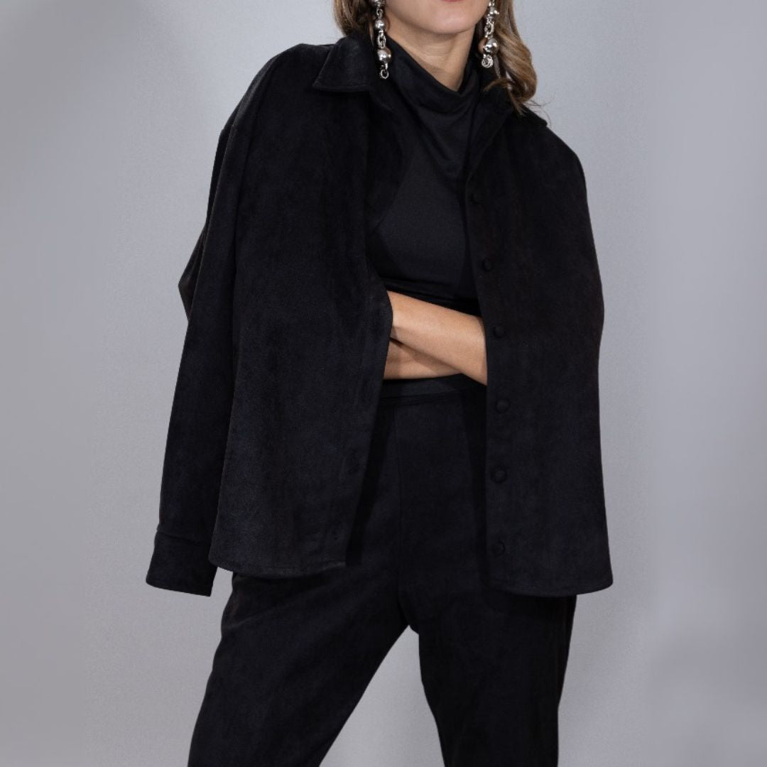 Timeless two-piece suede set offered in Camel and Black.