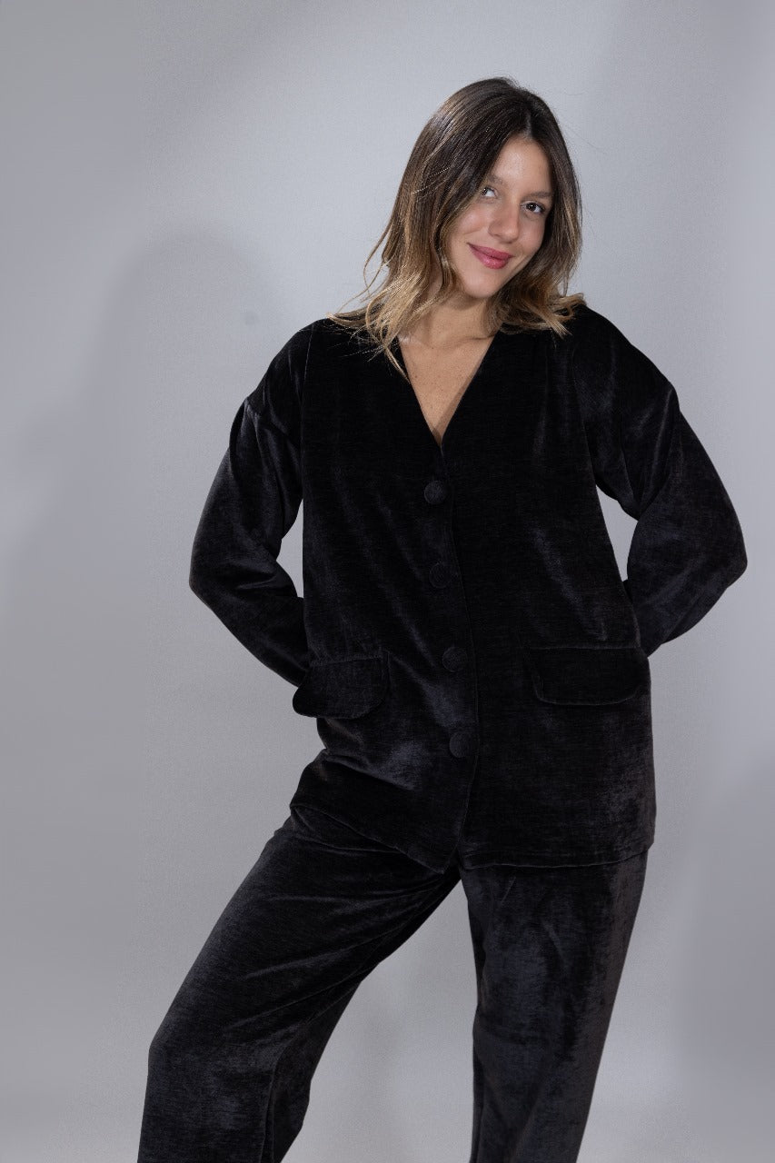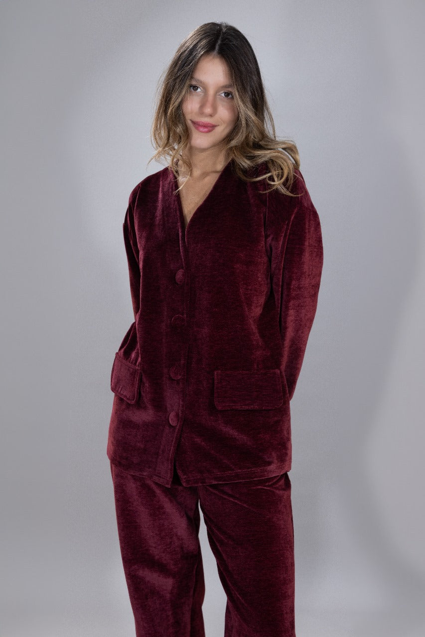 Matching set available in navy blue, black, and burgundy.