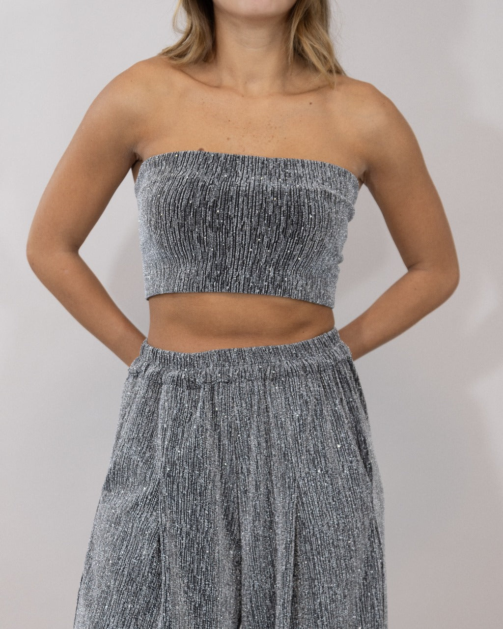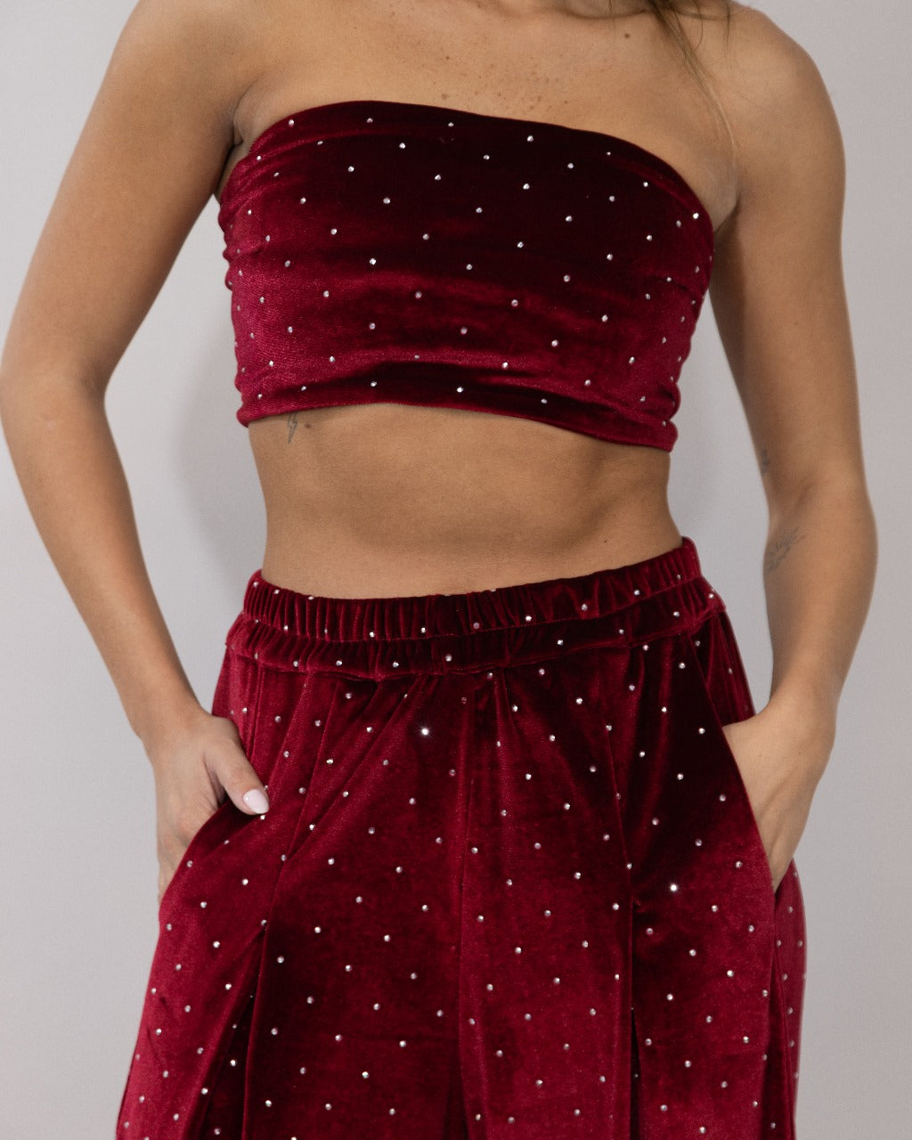 A luxe velvet crop top and pant set, finished with stud detailing. Available in Burgundy, Black, and Silver.